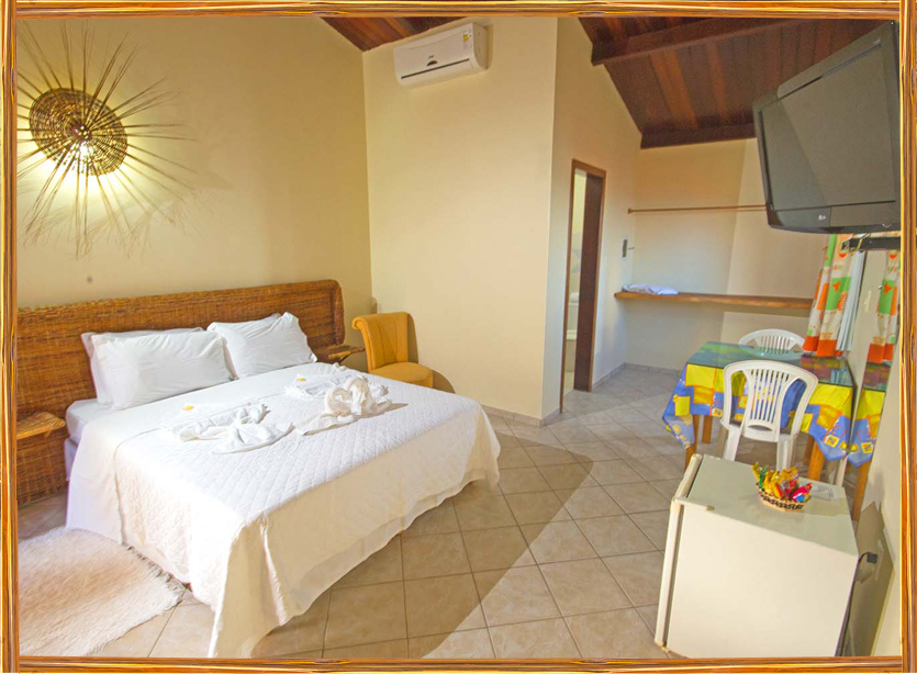 Contamos com quartos duplos, triplos e quádruplos com TV, cama king-size, cama box, ar condicionado digital, frigobar, ducha quente e varanda com rede, tudo planejamento para seu conforto.